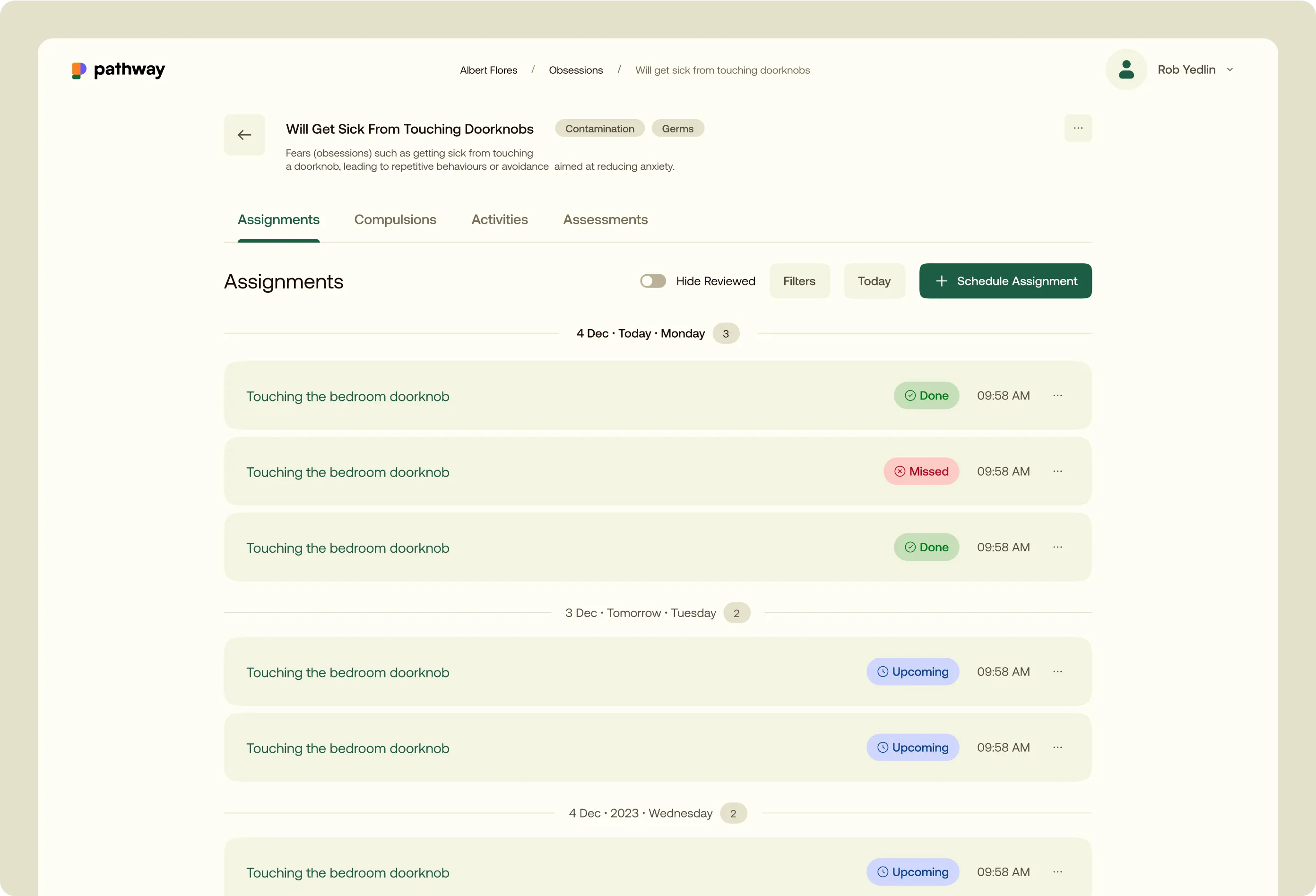 Pathway is an application designed for cognitive-behavioral therapists specializing in treating OCD and their clients. Traditionally, CBT therapy for obsessive-compulsive disorder involves daily completion of paper forms: documenting the mood of the day, recording the execution of specific exercises, and rating the difficulty levels. These additional tasks can make therapy burdensome, leading many patients to abandon the process. Pathway aims to revolutionize CBT therapy for individuals dealing with OCD by making therapy management seamless for both therapists and their patients. As part of this project, we developed the branding, a web and mobile app for therapists, a mobile app for patients, and a comprehensive website.